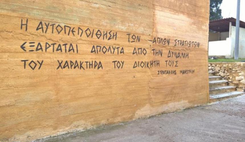 Το Συνδικάτο Οικοδόμων καταγγέλλει και καταδικάζει το απαράδεκτο και πολύ σοβαρό περιστατικό σε στρατιωτική μονάδα στο Μανταμάδο της Λέσβου, στο 265 Μηχανοκίνητο Τάγμα Εθνοφυλακής, που με ευθύνη του διοικητή της μονάδας «στόλισαν» το τείχος του στρατοπέδου με φασιστικό ρητό στρατάρχη της Ναζιστικής Βέρμαχτ και εγκληματία πολέμου.