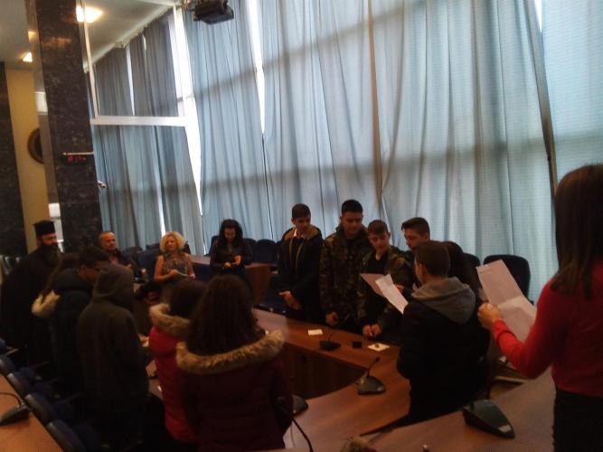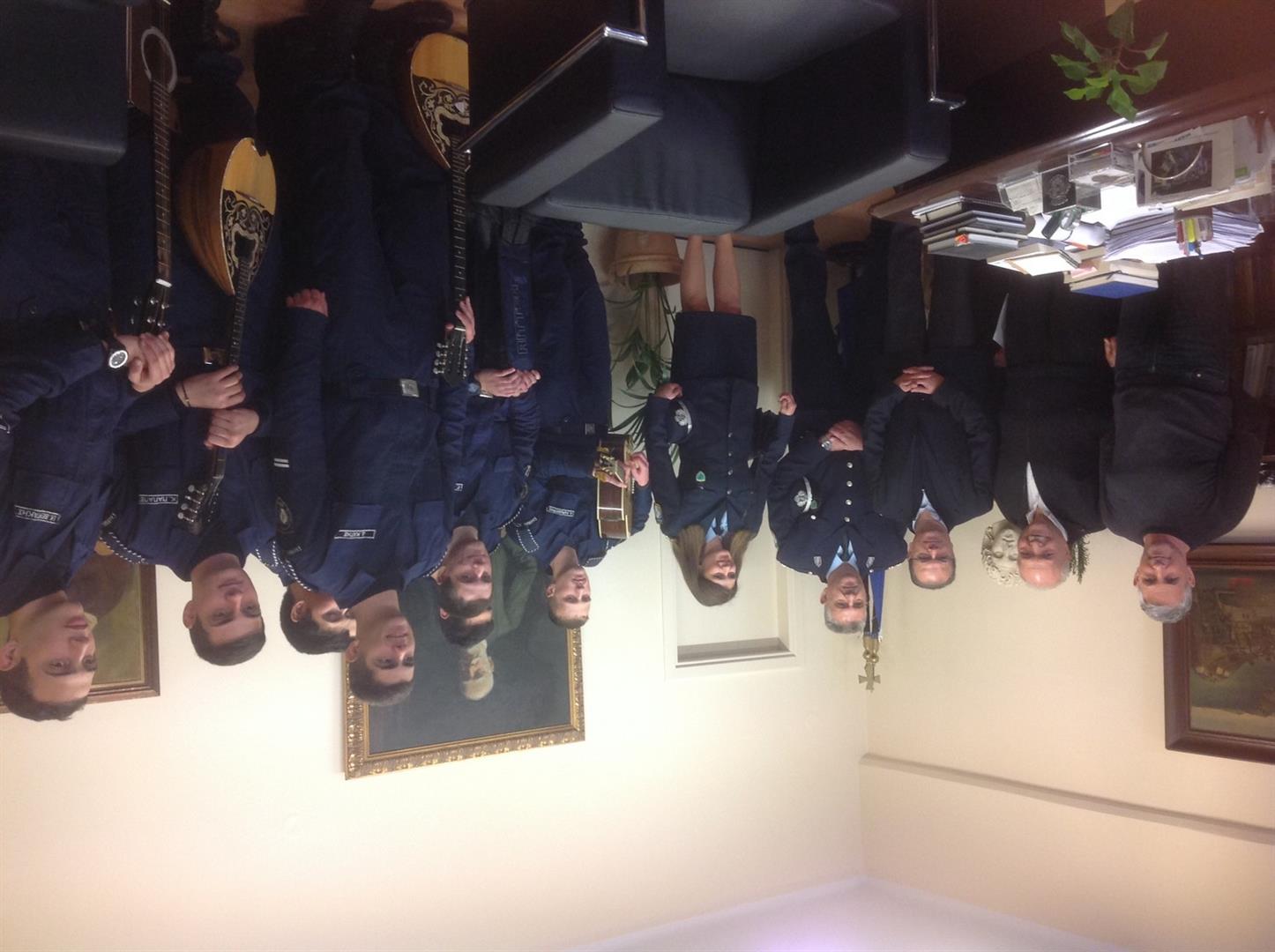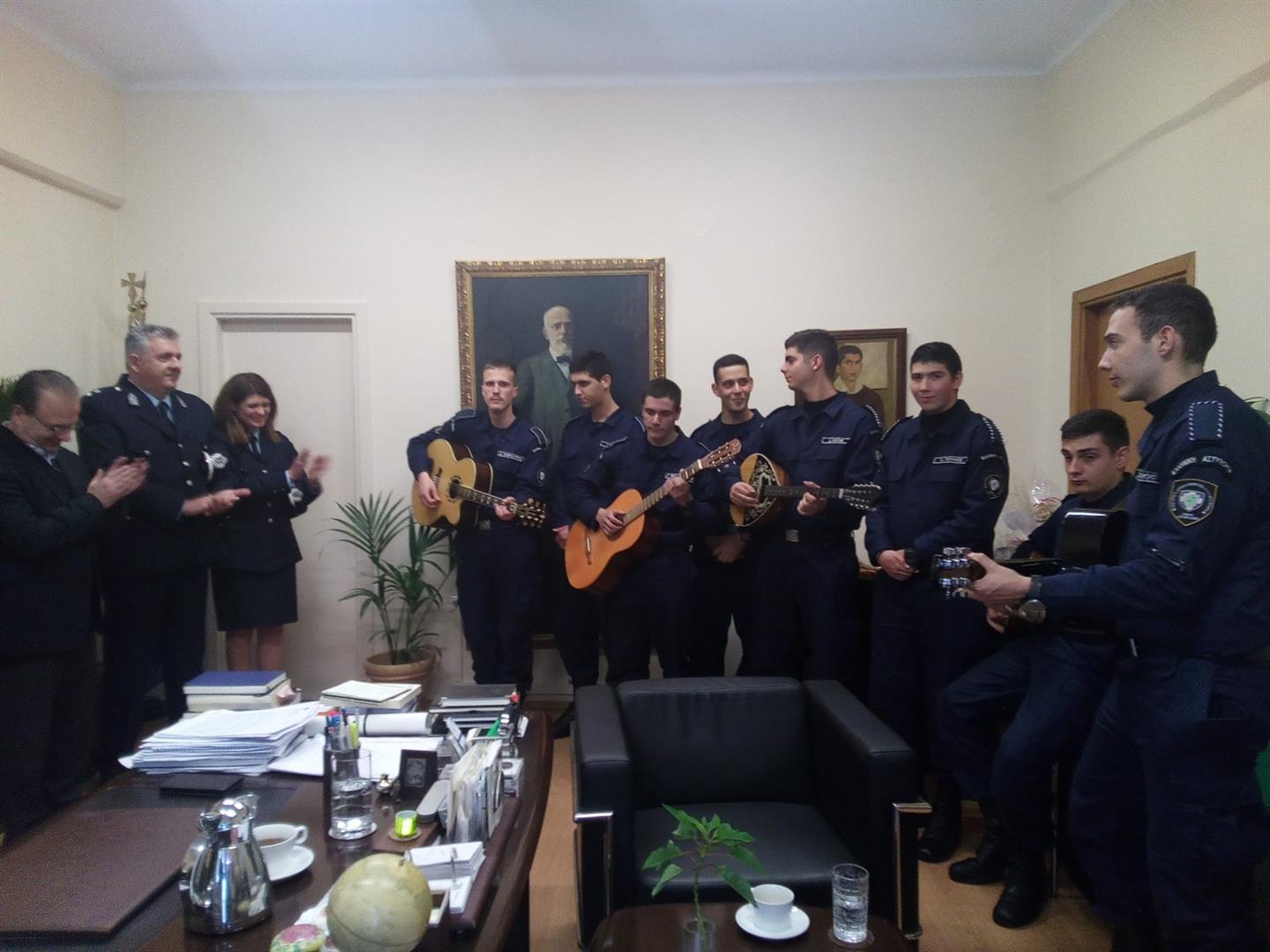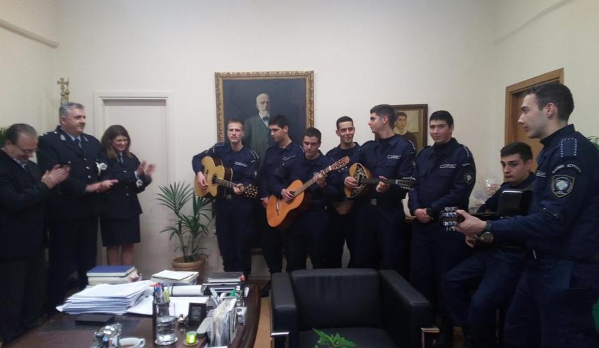 Τη Σχολή Αστυφυλάκων με το Διοικητή κ. Γερμανάκη Σπύρο και τους Δόκιμους οι οποίοι με τη συνοδεία μουσικών οργάνων έψαλλαν παραδοσιακά κάλαντα της Κρήτης στο Δήμαρχο, τον Πρόεδρο Δημοτικού Συμβουλίου Ρεθύμνης κ. Τ.Παπαδουράκη και το Δημ Σύμβουλο κ. Μ. Τσιμπισκάκη.