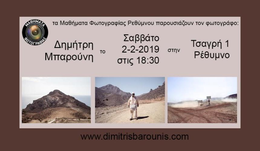 Θα έχουμε την ευκαιρία να δούμε την ξεχωριστή δουλειά του Δημήτρη Μπαρούνη στην παρουσίαση που διοργανώνουν τα Μαθήματα Φωτογραφίας Ρεθύμνου το Σάββατο 2 Φεβρουαρίου.