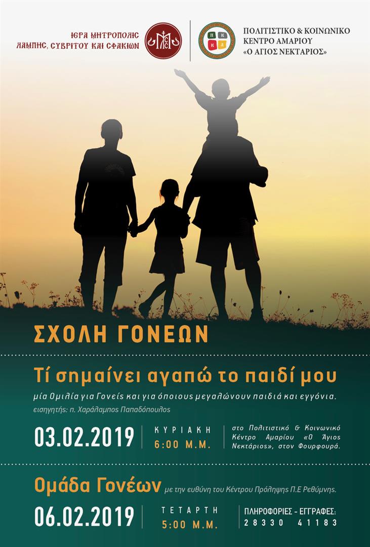 Η Σχολή Γονέων του Πολιτιστικού & Κοινωνικού Κέντρου Αμαρίου «Ο Άγιος Νεκτάριος», της Ι. Μητροπόλεως Λάμπης, Συβρίτου και Σφακίων, διοργανώνει ομιλία με το παραπάνω θέμα την Κυριακή 3 Φεβρουαρίου και ώρα 6.00μ.μ με ομιλητή τον Θεολόγο και Συγγραφέα Πρωτοπρεσβύτερο π. Χαράλαμπο Παπαδόπουλο, Κληρικό της Ι. Μητροπόλεως Γορτύνης και Αρκαδίας.