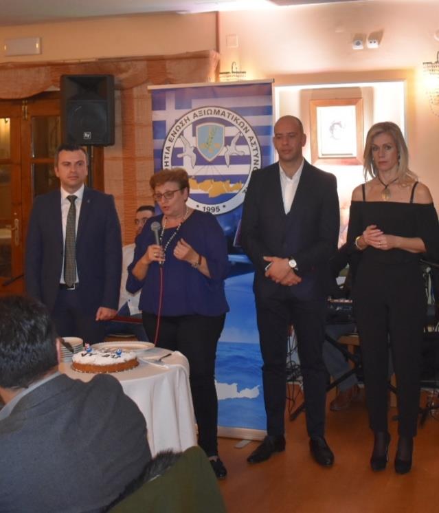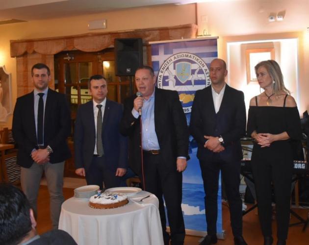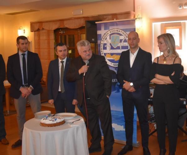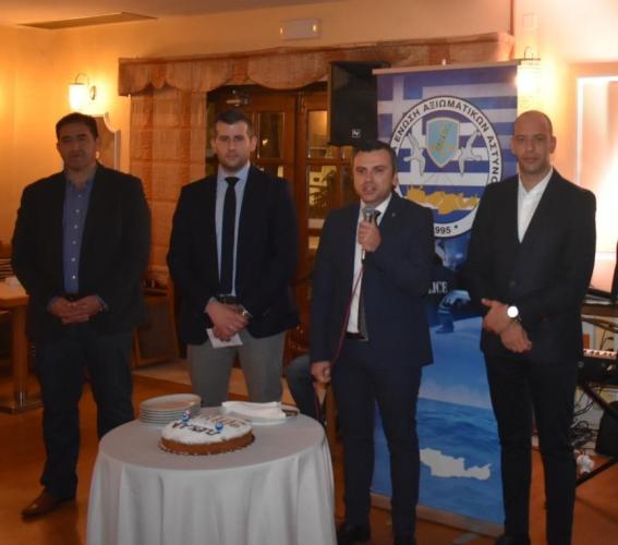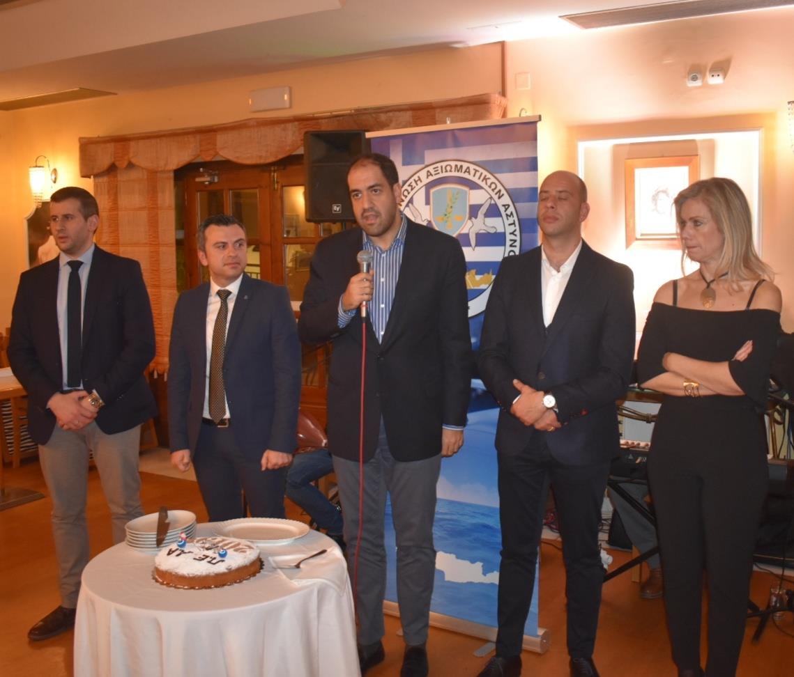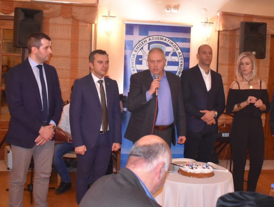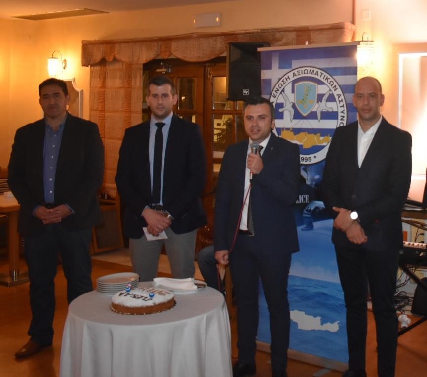 Ο Πρόεδρος της Ένωσης Αξιωματικών ΕΛ.ΑΣ. Περιφέρειας Κρήτης κ. Στέλιος Καρακούδης αφού ευχήθηκε σε όλους τους συναδέλφους να έχουν μία καλή και δημιουργική χρονιά με υγεία για αυτούς και τις οικογένειές τους, ευχαρίστησε όλα τα μέλη που στήριξαν ξανά το προεδρείο στις πρόσφατες εκλογές που διεξήχθησαν τον περασμένο Οκτώβριο, δίνοντας έτσι τη δυνατότητα να ανανεωθεί η θητεία του για τρίτη συνεχή φορά συνεχίζοντας απρόσκοπτα το έργο του. Σημείωσε δε ότι ως προεδρείο αισθανόμαστε περήφανοι διότι στις δύο τελευταίες θητείες η Ένωση εκπροσωπήθηκε από Αξιωματικούς από κάθε Αστυνομική Διεύθυνση του Νησιού, όπως άλλωστε το ίδιο επετεύχθη και στη νέα τριετία με την τελευταία εκλογική διαδικασία. Το γεγονός αυτό αποδεικνύει ότι τα τελευταία 7 χρόνια στην Ένωση Αξιωματικών Κρήτης επικρατεί κλίμα ομόνοιας - σύμπνοιας και ενότητας, πράγμα που είναι και το ζητούμενο προκειμένου να επιδιώκονται σε κάθε στάδιο τα καλύτερα δυνατά αποτελέσματα προς όφελος των συναδέλφων - των υπηρεσιών και της κοινωνίας μας γενικότερα. Διότι πέραν των άλλων, ανάφερε, ότι στόχος του προεδρείου στο σωματείο ήταν και είναι η διατήρηση της Ελληνικής Αστυνομίας στις υψηλότερες θέσεις στην εμπιστοσύνη των πολιτών μεταξύ των θεσμών του κράτους, όπως άλλωστε δείχνουν τελευταία επίσημες έρευνες που έχουν δει το φως της δημοσιότητας, καθώς και η αναβάθμιση των παρεχόμενων υπηρεσιών ασφάλειας σε κάθε περιοχή του νησιού μας. Τέλος εξήρε τις επιτυχίες που σημείωσαν οι αστυνομικές υπηρεσίες στο Νησί το έτος που μας πέρασε, με κορυφαία υπόθεση την εξιχνίαση του επιχειρηματία κ. Λεμπιδάκη, συγχαίροντας για άλλη μία φορά το Γενικό Περιφερειακό Αστυνομικό Διευθυντή Υποστράτηγο κ. Κωνσταντίνο Λαγουδάκη και στο πρόσωπό του όλους του συναδέλφους που εργάστηκαν με ζήλο και αυταπάρνηση για την επιτυχή έκβαση της συγκεκριμένης υπόθεσης. Ενόψει και των επερχόμενων κρίσεων των Ανώτατων Αξιωματικών της ΕΛ.ΑΣ., ο Πρόεδρος ευχήθηκε επίσης καλή επιτυχία στους Αξιωματικούς της Ένωσης μας που πρόκειται να κριθούν, με την ελπίδα να αναγνωρισθεί στο πρόσωπο του καθένα το έργο που έχει επιτελέσει τόσο κατά τη διάρκεια του τελευταίου έτους από τη θέση ευθύνης που του έχει ανατεθεί, όσο και κατά τη διάρκεια της υπηρεσιακής του καριέρας.