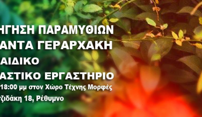 Στο πλαίσιο της εικαστικής φιλοξενίας 'Plakias Art Residency 2019' θα πραγματοποιηθούν δύο μέρες με αφήγηση παραμυθιών από την Αμάντα Γεραρχάκη και θα ακολουθήσουν εικαστικά workshop στην ΛRT Gallery Μορφές - Γοβατζιδάκη 18, 74100 Ρέθυμνο