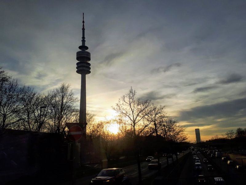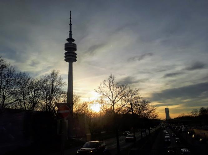 Στη συνέχεια επισκεφθήκαμε τον Olympiaturm, τον πύργο της ραδιοτηλεόρασης, ύψους 185 μ. Η άνοδος με τον ανελκυστήρα γίνεται με ταχύτητα 7m/sec! Το πρώτο επίπεδο είναι στεγασμένο και μας δόθηκε η ευκαιρία να θαυμάσουμε την πόλη του Μονάχου από ψηλά. Η θέα, όμως, από το ανοικτό επίπεδο στα 190 μ. μας έκοψε την ανάσα. Αν και φυσούσε και έκανε αρκετό κρύο, μπορέσαμε να θαυμάσουμε το Ολυμπιακό πάρκο, που βρίσκεται ακριβώς από κάτω, καθώς και το στάδιο, όπου έγιναν οι μοιραίοι Ολυμπιακοί αγώνες του 1972. Μπορέσαμε, ακόμα, να βγάλουμε ονειρεμένες φωτογραφίες και να απολαύσουμε ένα πανέμορφο ηλιοβασίλεμα!