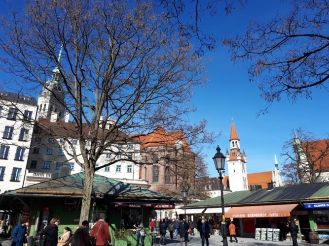 Όταν φτάσαμε στο κέντρο της πόλης του Μονάχου, ξεκίνησε η περιήγησή μας από την πλατεία Marienplatz, στο νέο και το παλιό Δημαρχείο, με τις διάσημες καμπάνες (Glockenspiel). Εκεί θαυμάσαμε την Peterskirche, την παλαιότερη εκκλησία της κεντρικής πόλης, την Frauenkirche με τους δύο πύργους-καμπαναριά, που θεωρείται και σύμβολο της πόλης, αλλά και την Viktualienmarkt, την υπαίθρια πλατεία με τα ψητοπωλεία και τα παραδοσιακά εδέσματα, γραφικά μαγαζάκια με λουλούδια και αναμνηστικά και, φυσικά, άφθονη μπύρα! Η τελευταία αυστηρά για ενήλικες, σύμφωνα με τον γερμανικό νόμο.
