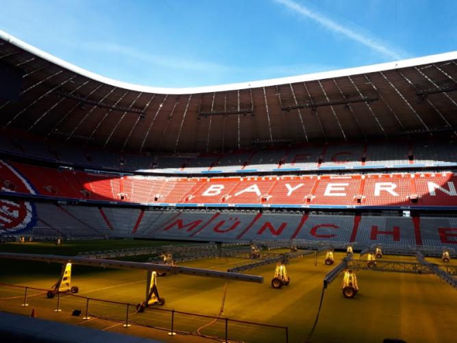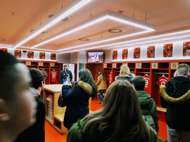 Επόμενος σταθμός ήταν το τεράστιο ποδοσφαιρικό γήπεδο της Allianz Arena, χωρητικότητας 71.137 θεατών! Οι κερκίδες, το θερμαινόμενο γρασίδι, τα αποδυτήρια των ομάδων, των διαιτητών και των προπονητών, οι μπουτίκ της FC Bayern Μονάχου και της TSV Μόναχο 1860 μας εντυπωσίασαν. Μάλιστα, ο ξεναγός μάς άφησε για λίγο να γίνουμε ποδοσφαιριστές, δίνοντάς μας την ευκαιρία να κατέβουμε τις σκάλες που οδηγούν στον αγωνιστικό χώρο. Αξίζει να σημειώσουμε ότι το γήπεδο εξωτερικά φωτίζεται με χρωματισμό ανάλογο με τη γηπεδούχο ομάδα: Bayern Μονάχου-κόκκινο, Μόναχο 1860-μπλε. Όταν γηπεδούχος είναι η Εθνική Γερμανίας, το χρώμα είναι άσπρο.