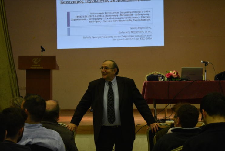 Καλεσμένος και κεντρικός ομιλητής ήταν ο κ. Μαρσέλλος Νίκος, Πολιτικός Μηχανικός, Msc, Ειδικός Εμπειρογνώμονας για το Σκυρόδεμα και Μέλος των Επιτροπών Σύνταξης ΚΤΣ-97 και ΚΤΣ-2016. Ο κ. Μαρσέλλος παρουσίασε τον νέο Κανονισμό Τεχνολογίας Σκυροδέματος 2016 σε πλήθος Πολιτικών Μηχανικών των νομών Χανίων, Ρεθύμνου και Ηρακλείου, Πολιτικών Μηχανικών Τεχνικών Υπηρεσιών, στελέχη μεγάλων εταιρειών παραγωγής σκυροδέματος, καθώς και σε μαθητές και καθηγητές του αντίστοιχου Τομέα από το ΕΠΑ.Λ. Χανίων και του Εσπερινού ΕΠΑ.Λ. Ηρακλείου.
