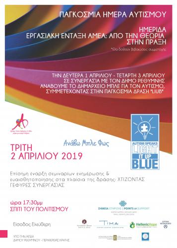 Οι δράσεις ξεκινούν τη Δευτέρα 1η Απριλίου έξω από το Δημαρχείο Ρεθύμνου, στι 6.00 μμ με ενημέρωση από τους εκπαιδευτές και του γονείς του Συλλόγου για θέματα που αφορούν τον αυτισμό, και προσφορά ενημερωτικού υλικού από το Κέντρο Δημιουργικής Απασχόλησης ΑμέΑ και τις ομάδες ενηλίκων αμέα της δράσης ΚΟΙΝΩΝΙΚΌ ΣΤΕΚΙ ΑΜΕΑ ΡΕΘΥΜΝΟΥ. Στις 7.30 μμ θα γίνει η φωταγώγηση του Δημαρχείου Ρεθύμνου και του Λιμενικού Ταμείου Ρεθύμνου με μπλε χρώμα, ενδεικτικά ως κίνηση παγκόσμιας ευαισθητοποίησης και κίνησης και συμπόρευσης. Η διεθνής αυτή δράση ονομάζεται LIGHT IT UP BLUE και είναι γνωστή σε όλο τον κόσμο, μια και στις πλέον γνωστές πόλεις του πλανήτη μας φωταγωγούνται πολλά δημόσια κτήρια με γιορτινή διάθεση ΜΠΛΕ για τον Αυτισμό στις 2 Απριλίου.