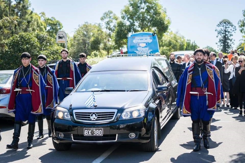 Νεαρά Κρητικόπουλα της Κρητικής Αδελφότητας του Σύδνεϋ άνοιξαν την πομπή κατά την νεκρώσιμη ακολουθία ενώ μια ομάδα 8 επίλεκτών Βρακοφόρων από την Παγκρήτια Ένωση Μελβούρνης, την Κρητική Αδελφότητα Μελβούρνης και την Κρητική Αδελφότητα Σύδνεϋ ντυμένοι για την περίσταση με μαύρα στιβάνια, μαύρο κουμπωμένο πουκάμισο και το ασημένιο μαχαίρι να κοιτάζει κάτω συνόδεψαν την σωρό στην νεκροφόρα του αθάνατου ποιμενάρχη στην τελευταία του κατοικία.