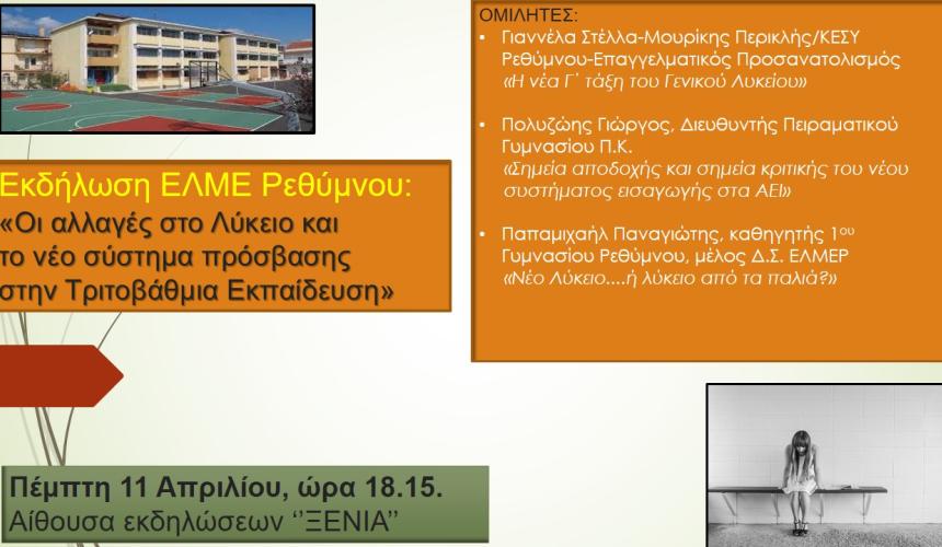 Η ΕΛΜΕ Ρεθύμνου διοργανώνει εκδήλωση για τις αλλαγές στο Λύκειο την Πέμπτη 11 Απριλίου, ώρα 18.15 στην αίθουσα εκδηλώσεων του Φοιτητικού-Πολιτιστικού Κέντρου ‘’ΞΕΝΙΑ’’ (παραλιακή οδός).