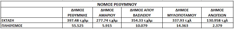 Για να έχουμε μια εικόνα των μεγεθών παραθέτουμε και έναν πίνακα με τον πληθυσμό και την έκταση του κάθε Δήμου: