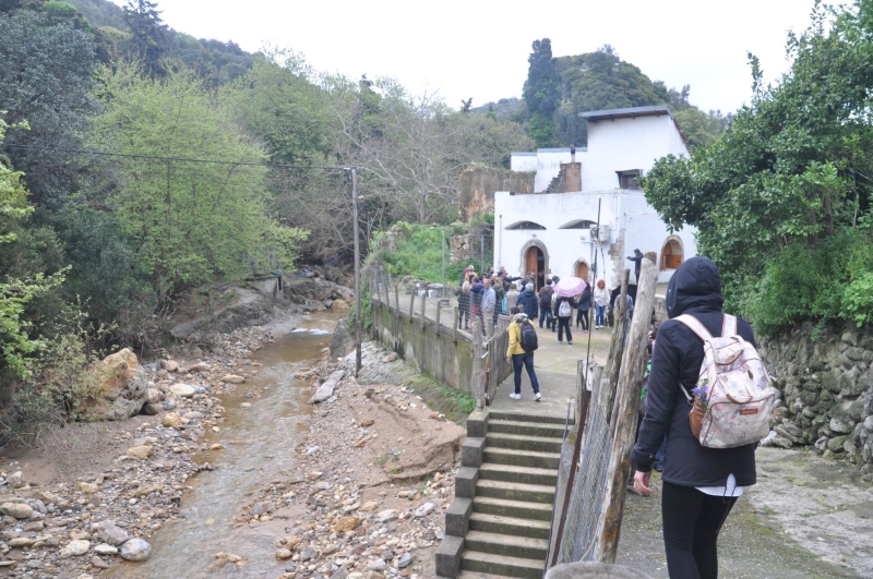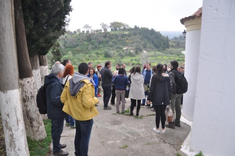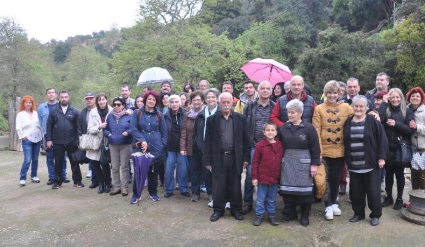 Εν τω μεταξύ ο καιρός βάρυνε και στα υψώματα εμφανίστηκε ομίχλη, ενώ άρχισαν να πέφτουν και οι πρώτες ψιχάλες, οπότε αποφασίστηκε να πραγματοποιηθεί με αυτοκίνητα η μετακίνηση προς τα δύο επόμενα χωριά. Οι στάσεις περιήγησης, κατά μήκος του όμορφου φαραγγιού των Καψαλιανών, έγιναν στον παλιότερα σπηλαιώδη ναό του Αγίου Αντωνίου και στην Παναγία την Γαλατού, με το έθιμο του τριψίματος του στήθους με «σπηλαιόγαλα» από τις λεχώνες που δεν κατέβαζαν γάλα. Οι γυναίκες αυτές φρόντιζαν επίσης να κρεμούν κλωστίτσες από τις φασκιές των νεογέννητων παιδιών τους στη διπλανή δάφνη και στη βραχοσκεπή, που σήμερα βρίσκεται εγκιβωτισμένη στο ιερό της ομώνυμης εκκλησίας. Ακολούθησε στάση στον ναό του Μιχαήλ Αρχαγγέλου των Καψαλιανών, όπου τους εκδρομείς φιλοδώρησε με παραδοσιακό κέρασμα η Κούλα Μαράκη.