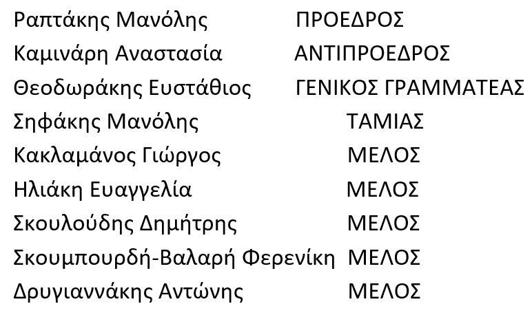 Η σύνθεση του νέου Διοικητικού Συμβουλίου του Περιφερειακού Τμήματος Ρεθύμνου, όπως αυτή διαμορφώθηκε μετά τη συγκρότηση σε σώμα είναι.: