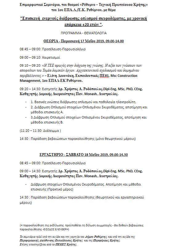 Ο Τομέας δομικών έργων του προχωράει στην δεύτερη διοργάνωσή του στα πλαίσια του νέου θεσμού «Ρέθυμνο - Τεχνική πρωτεύουσα Κρήτης» με ένα διήμερο Επιμορφωτικό Σεμινάριο στις 17 και 18 Μαΐου στο Ρέθυμνο, με θέμα "Επισκευή ενεργούς διάβρωσης οπλισμού σκυροδέματος, με χρονική επάρκεια +20 ετών ", με εισηγητή τον Δρ. Ροδόπουλο Χρήστο.