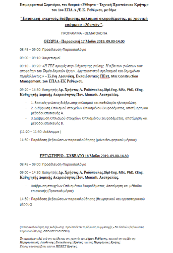 Το σεμινάριο είναι δομημένο σε θεωρητικό μέρος και εργαστηριακό. Το θεωρητικό θα διεξαχθεί στο «Ξενία» την Παρασκευή 17 Μαΐου 2019, ώρα 09.00-14.30, και το εργαστηριακό στο 1ο ΕΠΑ.Λ. / Ε.Κ. Ρεθύμνου το Σάββατο 18 Μαΐου 2019 , ώρα 09.00-14.30. .