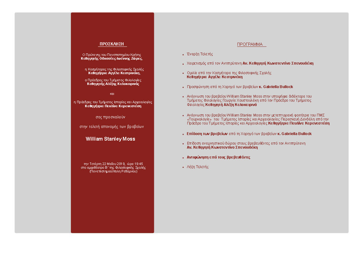 Την Τετάρτη 22 Μαΐου, ώρα 19.45, θα πραγματοποιηθεί στα Διδακτήρια της Φιλοσοφικής Σχολής (Αμφιθέατρο Β) του Πανεπιστημίου Κρήτης η τελετή απονομής των βραβείων William Stanley Moss για το έτος 2019.