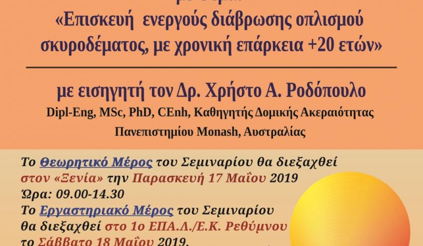 Ο «Τομέας Δομικών έργων, Αρχιτεκτονικού σχεδιασμού και δομημένου περιβάλλοντος», του 1ου ΕΠΑ.Λ./Ε.Κ. Ρεθύμνου προχωράει στην δεύτερη διοργάνωσή του, στα πλαίσια του νέου θεσμού «Ρέθυμνο – Τεχνική πρωτεύουσα Κρήτης», με ένα διήμερο Επιμορφωτικό Σεμινάριο στις 17 και 18 Μαΐου στο Ρέθυμνο, με θέμα «Επισκευή ενεργούς διάβρωσης οπλισμού σκυροδέματος, με χρονική επάρκεια +20 ετών», με εισηγητή τον Δρ. Ροδόπουλο Χρήστο.