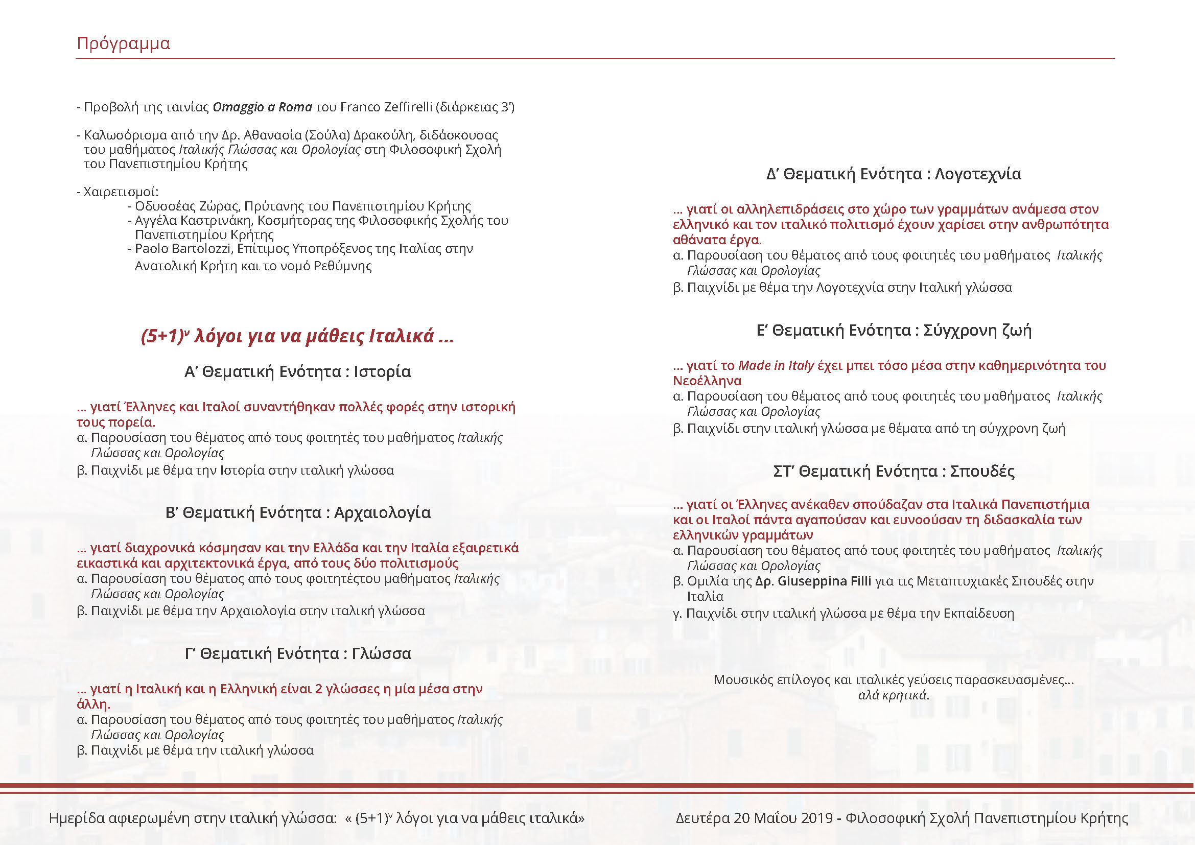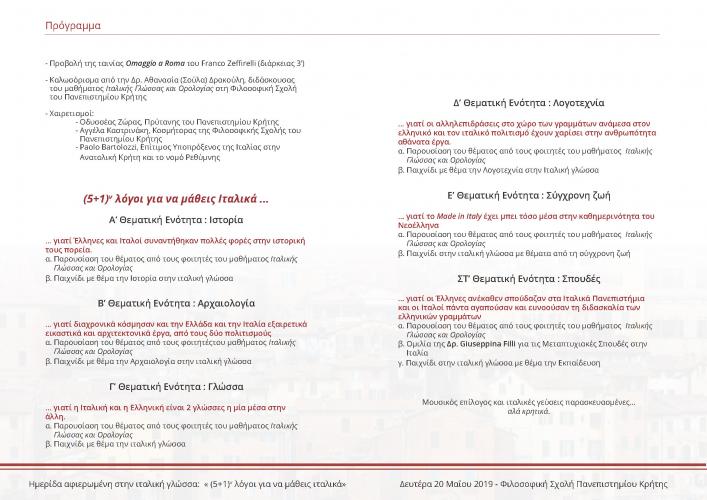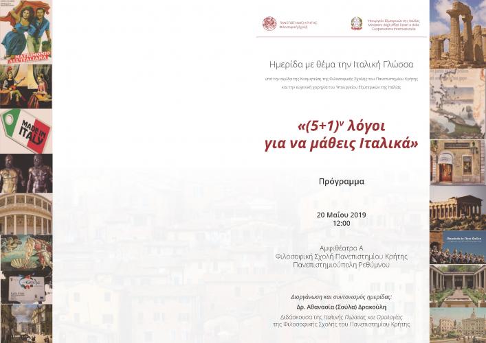 της Κοσμητείας της Σχολής και την ευγενική χορηγία του Ιταλικού Υπουργείου Εξωτερικών, στις 20 Μαΐου 2019, 12:00 – 14:30, στο αμφιθέατρο Α των διδακτηρίων