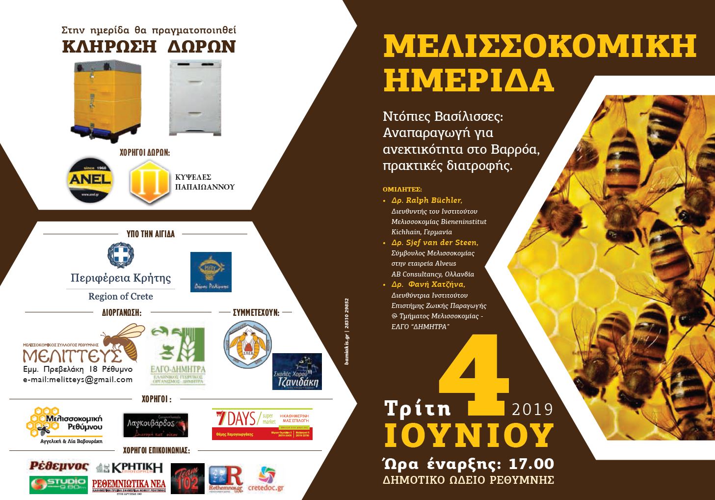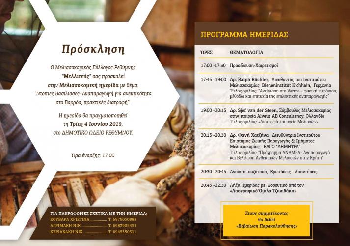 Ο Μελισσοκομικός Σύλλογος Ρεθύμνης «ΜΕΛΙΤΤΕΥΣ» καλεί κάθε ενδιαφερόμενο μελισσοκόμο σε Ημερίδα Μελισσοκομίας με θέμα «Ντόπιες Βασίλισσες: Αναπαραγωγή για ανθεκτικότητα στο Βαρρόα, πρακτικές διατροφής» που θα πραγματοποιηθεί την Τρίτη 4 Ιουνίου 2019, από 17.00 έως 22.00 στη αίθουσα εκδηλώσεων του Μουσικού Ωδείου Ρεθύμνου
