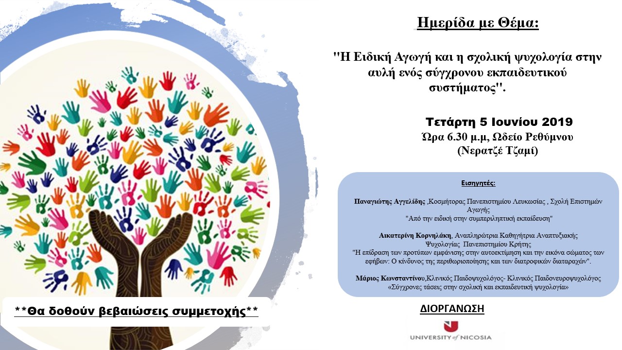 H εκδήλωση αφορά την ειδική αγωγή και την σχολική ψυχολογία επιπρόσθετα θα αναφερθούν και όλες οι νέες εκπαιδευτικές τάσεις που τις απαρτίζούν. Διοργανώνεται στo Ρέθυμνο.