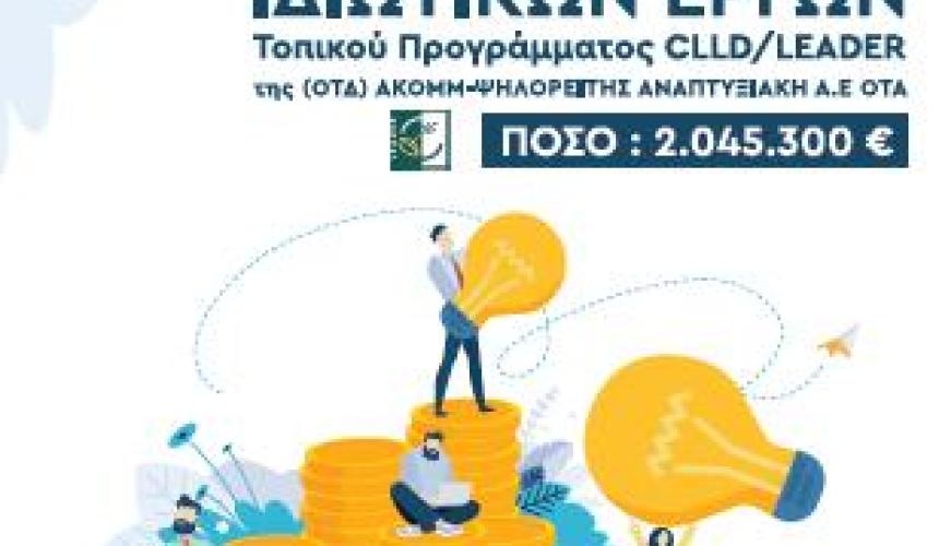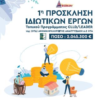 Η Ομάδα Τοπικής Δράσης (ΟΤΔ) ΑΚΟΜΜ-ΨΗΛΟΡΕΙΤΗΣ ΑΝΑΠΤΥΞΙΑΚΗ Α.Ε ΟΤΑ ενημερώνει τους ενδιαφερόμενους επενδυτές ότι παρατάθηκε η καταληκτική ημερομηνία υποβολής προτάσεων για την 1η πρόσκληση εκδήλωσης ενδιαφέροντος υποβολής αιτήσεων στήριξης στο πλαίσιο του μέτρου 19.2 (Ιδιωτικά Έργα) του Τοπικού Προγράμματος CLLD/LEADER