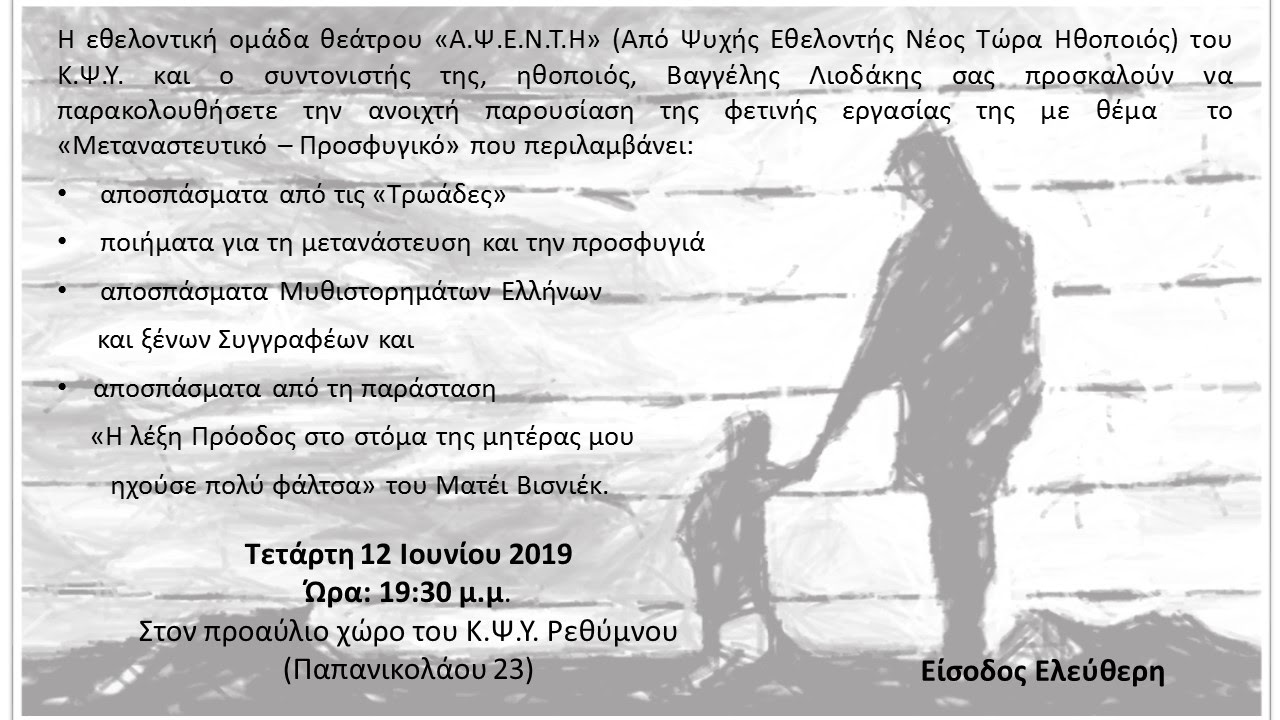 Στο πλαίσιο λειτουργίας της η εθελοντική ομάδα θεάτρου «Α.Ψ.Ε.Ν.Τ.Η» (Από Ψυχής Εθελοντής Νέος Τώρα Ηθοποιός) του Κ.Ψ.Υ. και ο συντονιστής της, ηθοποιός, Βαγγέλης Λιοδάκης σας προσκαλούν την Τετάρτη 12 Ιουνίου 2019 στις 19:30 μ.μ. στον προαύλιο χώρο του Κ.Ψ.Υ. Ρεθύμνου (Παπανικολάου 23), για να παρακολουθήσετε την ανοιχτή παρουσίαση της φετινής εργασίας της με θέμα το Μεταναστευτικό - Προσφυγικό που περιλαμβάνει: αποσπάσματα από τις «Τρωάδες», ποιήματα για τη μετανάστευση και τη προσφυγιά, αποσπάσματα Μυθιστορημάτων Ελλήνων και Ξένων Συγγραφέων και αποσπάσματα από τη παράσταση «Η λέξη Πρόοδος στο στόμα της μητέρας μου ηχούσε πολύ φάλτσα» του Ματέι Βισνιέκ.