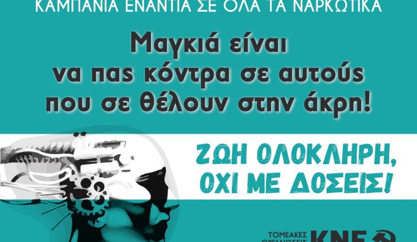 Η ΚΝΕ επιδιώκει να ανέβουν οι αντιστάσεις και τα αντανακλαστικά της νεολαίας γύρω από τέτοιες αντιδραστικές, ψευτομοντέρνες και επικίνδυνες απόψεις και θεωρίες. Θέλουμε να αναδείξουμε ότι τα ναρκωτικά, ως κοινωνικό φαινόμενο είναι αποτέλεσμα του σημερινού καπιταλιστικού συστήματος και των αδιεξόδων που γεννά για τη συντριπτική πλειοψηφία των νέων ανθρώπων. Όσο οξύνονται τα αδιέξοδα του συστήματος, η κρίση, θα δυναμώνουν και οι παράγοντες που το αναπαράγουν.