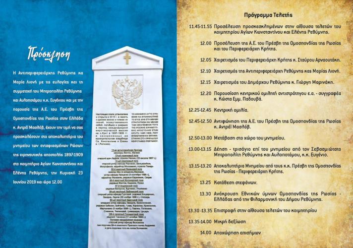 Αποκαλυπτήρια επιτύμβιας στήλης -κενοταφίου των θυσιασθέντων (στρατιωτικών και πολιτών), που ανήκαν στη Ρωσική ειρηνευτική αποστολή στην Κρήτη- νομό Ρεθύμνης κατά τα έτη 1897-1909 θα γίνει στην διάρκεια τελετής την Κυριακή 23 Ιουνίου και ώρα 12, στην αίθουσα