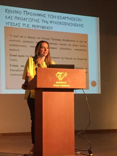 - Ευαισθητοποιήσεις έφηβων μαθητών Δευτεροβάθμιας Εκπαίδευσης Π. Ε Ρεθύμνου στην πρόληψη της χρήσης αλκοόλ στα σχολεία: 2ο ΕΠΑΛ, Μουσικό Γυμνάσιο, Γυμνάσιο Περάματος,3ο ΓΕΛ,4ο ΓΕΛ, Γυμνάσιο Συβρίτου, Γυμνάσιο Σπηλίου, ΕΠΑΛ Γαράζου, ΓΕΛ Επισκοπής, Πειραματικό Λύκειο, 3ο Γυμνάσιο , Γυμνάσιο Πανόρμου, 1ο ΕΠΑΛ, Γυμνάσιο Επισκοπής, 1ο Γυμνάσιο, 2ο Γυμνάσιο, Γυμνάσιο Ατσιποπούλου