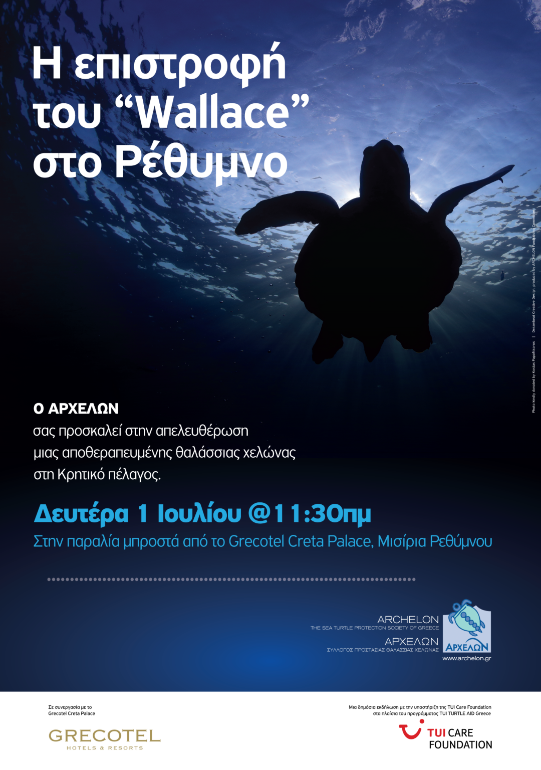 Τη Δευτέρα 1 Ιουλίου και ώρα 11.30, στην παραλία μπροστά από το ξενοδοχείο Grecotel Creta Palace, στα Μισίρια Ρεθύμνου, ελάτε να δείτε από κοντά την αποθεραπευμένη θαλάσσια χελώνα "Γουάλας" να επιστρέφει στο φυσικό της περιβάλλον.
