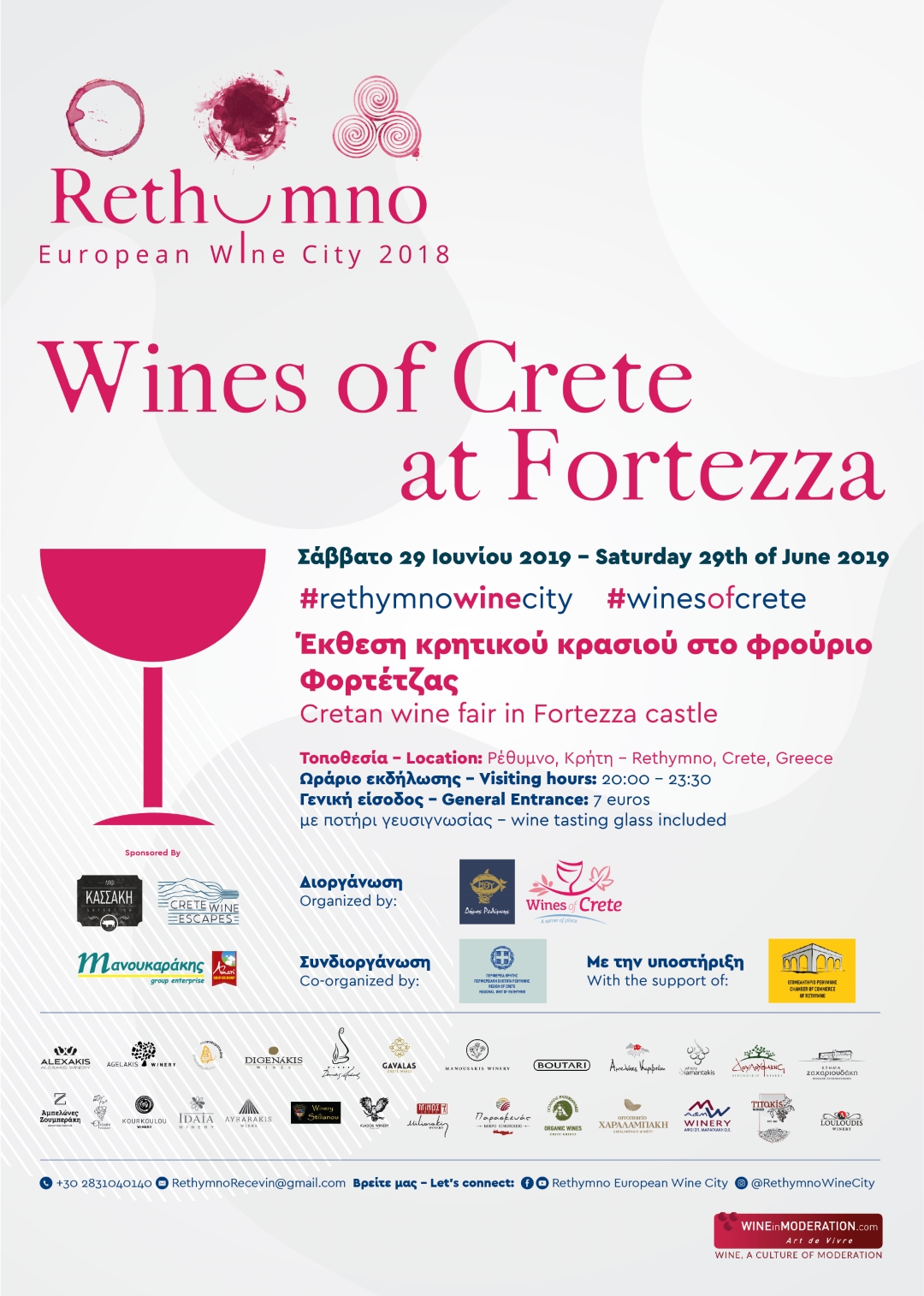 Για δεύτερη συνεχόμενη χρονιά, ο Δήμος Ρεθύμνης και το Δίκτυο Οινοποιών Κρήτης-Wines of Crete, διοργανώνουν την εκδήλωση γευσιγνωσίας κρητικού κρασιού Wines of Crete @ Fortezza, το Σάββατο 29 Ιουνίου 2019, με ωράριο 20:00-23:30.