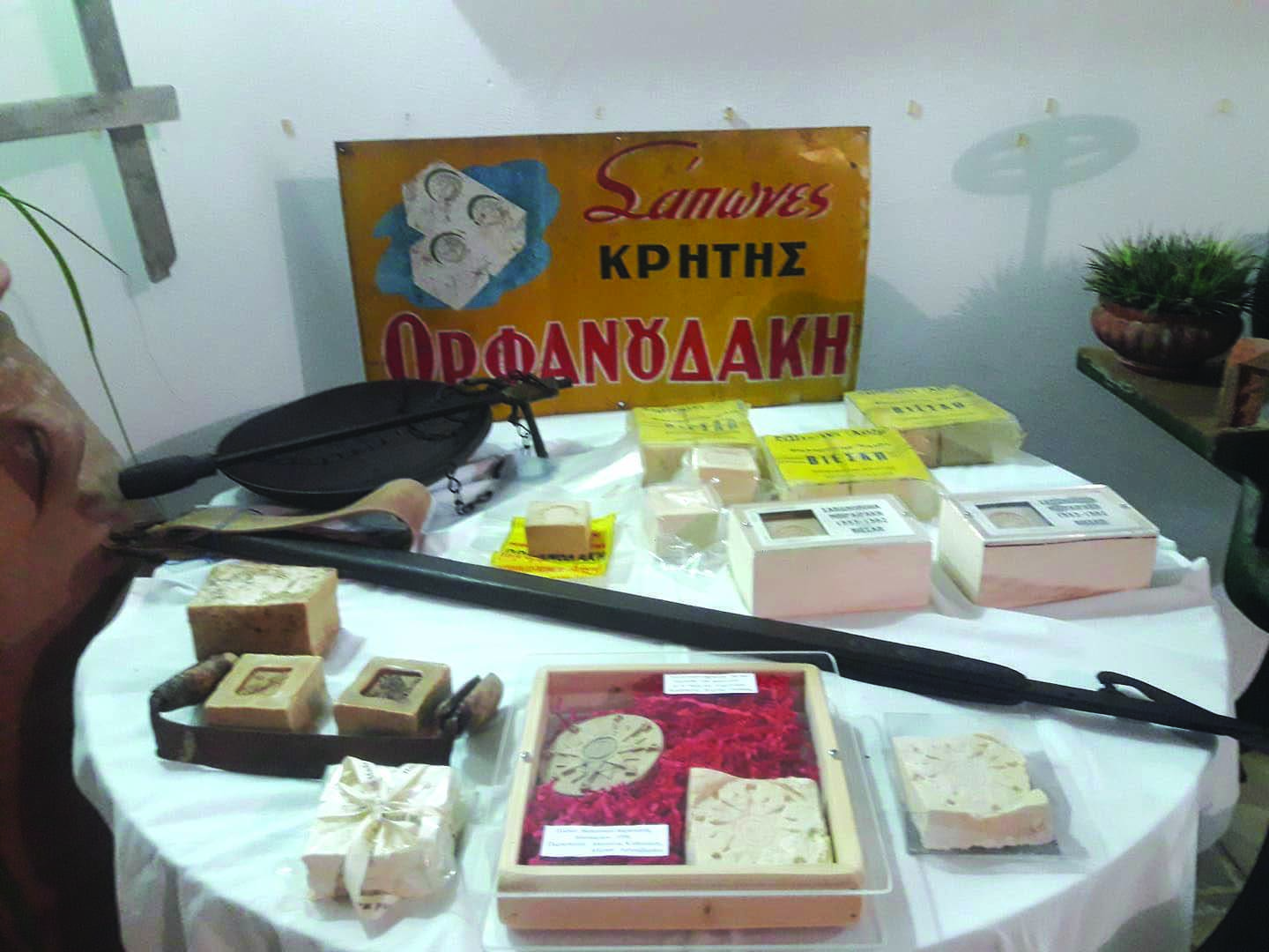 Και πρόσθεσε: «Όπως θα δείτε στην αίθουσα των Παραδοσιακών Επαγγελμάτων, πρόκειται για τέσσερις σφραγίδες σαπωνοποιείων του Ρεθύμνου, έναν ξύλινο κόπανο και δύο ξύστρες σαπουνιού. Και άλλοι, όμως, δωρητές φρόντισαν για τον εμπλουτισμό των προθηκών του Μουσείου με είδη σαπωνοποιίας. Ο Αριστόδημος Χατζηδάκης μας έχει προσφέρει παλιότερα μια ρεθεμνιώτικη ιδιοκατασκευή για το κόψιμο των σαπουνιών. Από την πλευρά της η οικογένεια Μπιρλιράκη μας προσέφερε μια συσκευασμένη τετράδα σαπουνιών της επιχείρησής τους, με την επωνυμία ΒΙΕΣΑΠ, μιας από τις τελευταίες στον τομέα της σαπωνοποιίας στο Ρέθυμνο».