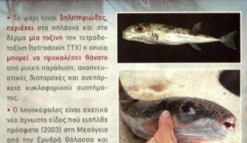 Μετά από συχνές αναφορές στα Μέσα Μαζικής Ενημέρωσης ότι ο Λαγοκέφαλος, μπορεί να καταναλωθεί αν κάποιος γνωρίζει πώς να τον καθαρίσει, καθώς και πληροφορίες ότι έχουν γίνει απόπειρες κατανάλωσης του συγκεκριμένου είδους, εφιστούμε την προσοχή των καταναλωτών, των επαγγελματιών & ερασιτεχνών αλιέων σχετικά με το ψάρι Lagocephalus sceleratus (λαγοκέφαλος) το οποίο έχει εξαπλωθεί και εγκατασταθεί στην Κρήτη.