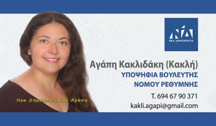 Λίγο πριν την προσφυγή στις κάλπες αισθάνομαι την ανάγκη να σας ευχαριστήσω όλους προκαταβολικά, επώνυμους και ανώνυμους συμπαραστάτες μου. Η συνδρομή σας στην προεκλογική μου προσπάθεια υπήρξε πολύτιμη. Αποτελεί για εμένα κληρονομιά και παρακαταθήκη. Έχει ζωγραφίσει στη μνήμη μου εικόνες και συμπεριφορές ανεξίτηλες, που με υποχρεώνουν να γίνομαι ακόμα καλύτερη, με στόχο και υποχρέωση τη συνεχή προσφορά προς τον συνάνθρωπο. Αυτό που πραγματικά θα ήθελα να σας ζητήσω είναι η ψήφος σας την Κυριακή να είναι η ψήφος της Αγάπης. Της Αγάπης για την Ελλάδα, της Αγάπης για την Κρήτη, της Αγάπης για το Ρέθυμνο. Για τον τόπο που γεννηθήκαμε, που κληρονομήσαμε από τους πατεράδες μας. Έχω ήδη δεσμευτεί, με εγγύηση την αγάπη που εισέπραξα, να δώσω τον καλύτερο μου εαυτό για το καλό όλων μας. Εύχομαι καλές εκλογές και να μπορέσουμε να χτίσουμε με το εκλογικό αποτέλεσμα το σκαλοπάτι για την πρόοδο και την ευημερία του τόπου μας.