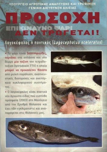 «Η Αποκεντρωμένη Διοίκηση Κρήτης, μέσω του Τμήματος Γεωργικών Εκμεταλλεύσεων & Αλιείας της Διεύθυνση Αγροτικών Υποθέσεων της, σας ενημερώνει ότι: Μετά από συχνές αναφορές στα Μέσα Μαζικής Ενημέρωσης ότι ο Λαγοκέφαλος, μπορεί να καταναλωθεί αν κάποιος γνωρίζει πώς να τον καθαρίσει, καθώς και πληροφορίες ότι έχουν γίνει απόπειρες κατανάλωσης του συγκεκριμένου είδους, εφιστούμε την προσοχή των καταναλωτών, των επαγγελματιών & ερασιτεχνών αλιέων σχετικά με το ψάρι Lagocephalus sceleratus (λαγοκέφαλος) το οποίο έχει εξαπλωθεί και εγκατασταθεί στην Κρήτη.