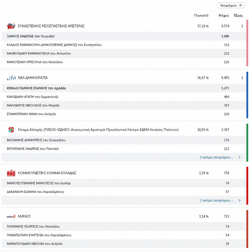 Σε 52,78 % ενσωμάτωση των εκλογικών τμημάτων, δηλαδή στα 114 από τα 216 στην περιφερειακή ενότητα Ρεθύμνου, ο ΣΥΡΙΖΑ συγκεντρώνει 37,39% και η ΝΔ 36,46% με τις 2 έδρες να κατανέμονται ανά μια σε κάθε κόμμα.
