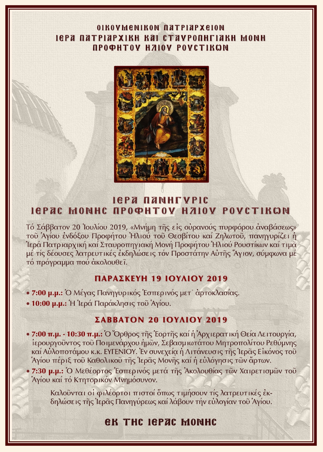 Το Σάββατον 20 Ιουλίου 2019, «Μνήμη της εις ουρανούς πυρφόρου αναβάσεως» του Αγίου ενδόξου Προφήτου Ηλιού του Θεσβίτου και Ζηλωτού, πανηγυρίζει η Ιερά Πατριαρχική και Σταυροπηγιακή Μονή Προφήτου Ηλιού Ρουστίκων και τιμά με τις δέουσες λατρευτικές εκδηλώσεις τον Προστάτην Αυτής Άγιον, σύμφωνα με το πρόγραμμα που ακολουθεί.