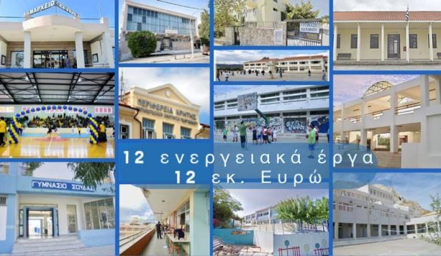 Δώδεκα νέα έργα εξοικονόμησης ενέργειας στα δημόσια κτίρια εντάσσονται στο Επιχειρησιακό Πρόγραμμα «ΚΡΗΤΗ» 2014-2020 με απόφαση του Περιφερειάρχη Κρήτης κ. Σταύρου Αρναουτάκη.