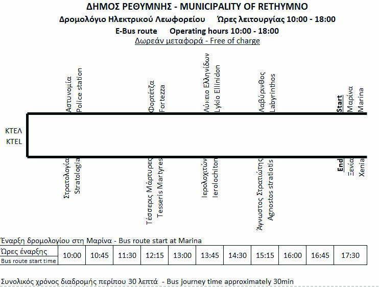 Το λεωφορείο έχει αγοραστεί και δρομολογηθεί για την εξυπηρέτηση του κοινού της πόλης στα πλαίσια του Προγράμματος Civitas Destinations με στόχο την βιώσιμη ανάπτυξη στο Ρέθυμνο. Η διαδρομή του διαρκεί περίπου 45 λεπτά.