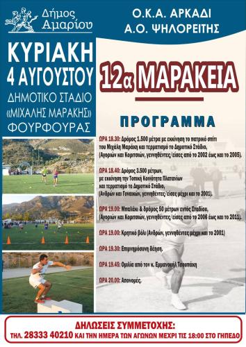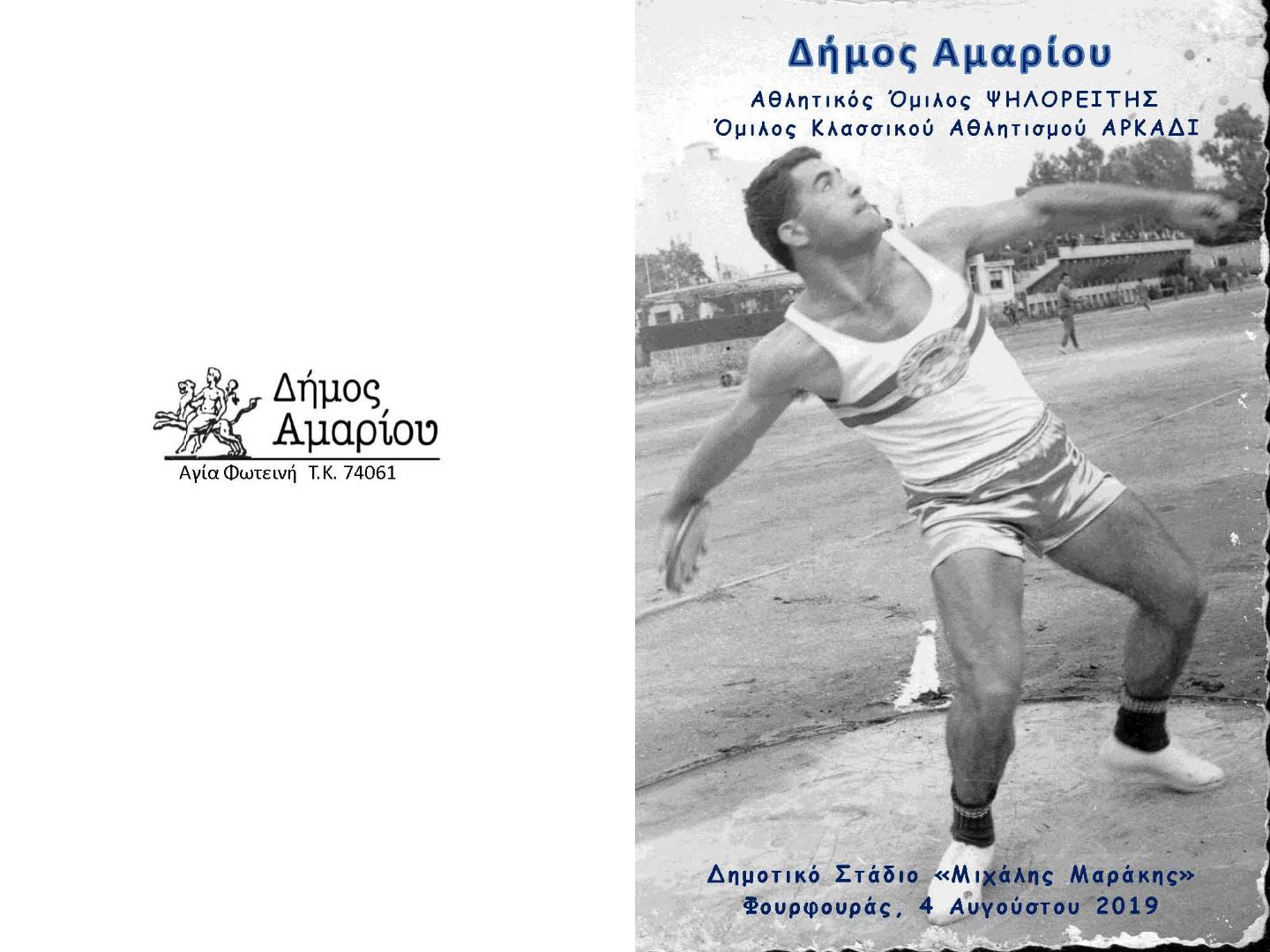 Ο ΔΗΜΟΣ ΑΜΑΡΙΟΥ, σε συνεργασία με τον Α.Ο. ΨΗΛΟΡΕΙΤΗ και τον Ο.Κ.Α. ΑΡΚΑΔΙ, διοργανώνουν αγώνες στίβου την Κυριακή 4 Αυγούστου 2019, στο πλαίσιο των πολιτιστικών και αθλητικών εκδηλώσεων, στη μνήμη του Μιχάλη Μαράκη, στο Δημοτικό Στάδιο «Μιχάλης Μαράκης» στο Φουρφουρά.