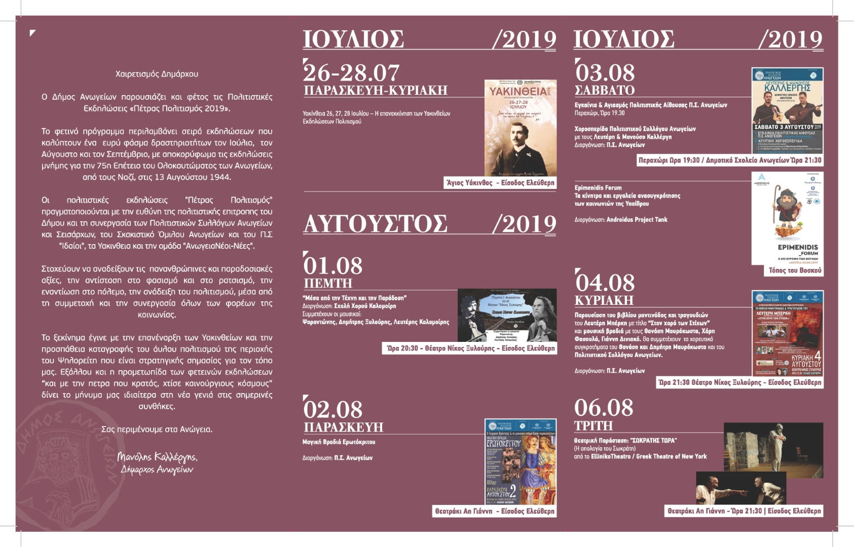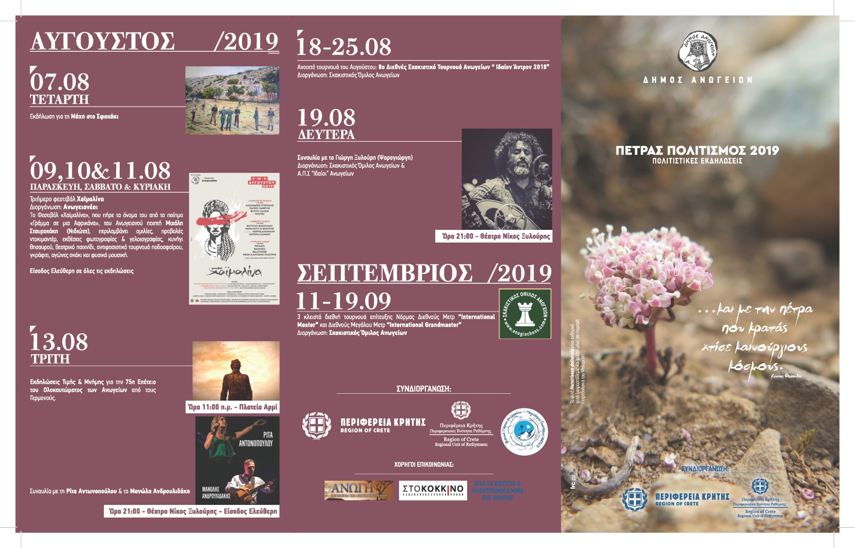 Ο Δήμος Ανωγείων σε συνδιοργάνωση με την Περιφέρεια Κρήτης και της Π.Ε. Ρεθύμνου παρουσιάζει και φέτος τις Πολιτιστικές Εκδηλώσεις «Πέτρας Πολιτισμός 2019».