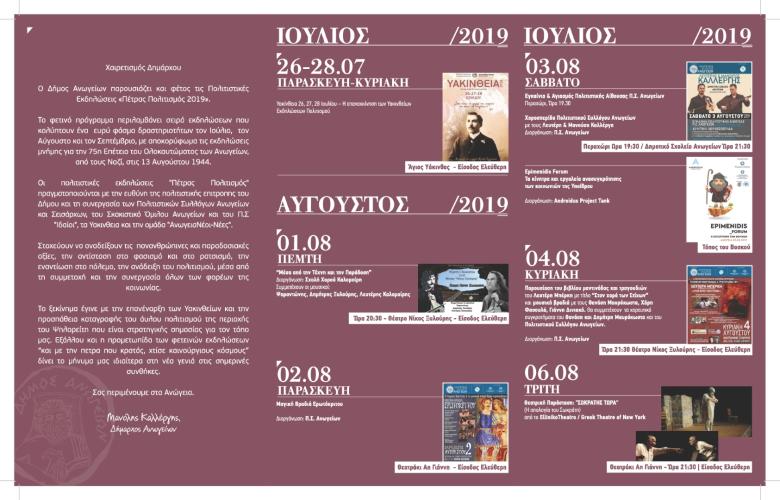 Το φετινό πρόγραμμα το οποίο έχει ξεκινήσει από τον Ιούλιο και διαρκεί έως και τον Σεπτέμβριο, περιλαμβάνει σειρά εκδηλώσεων που καλύπτουν ένα ευρύ φάσμα δραστηριοτήτων με αποκορύφωμα τις εκδηλώσεις μνήμης για την 75η Επέτειο του Ολοκαυτώματος των Ανωγείων, από τους Ναζί, στις 13 Αυγούστου 1944.