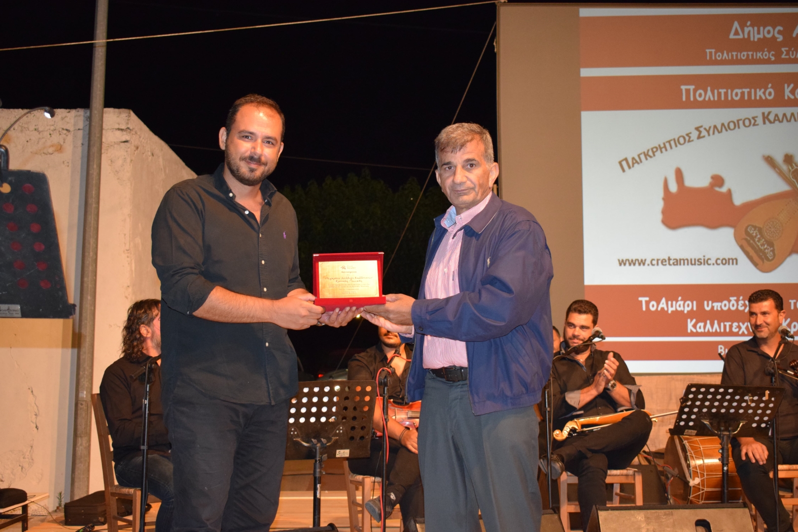 Μετά το τέλος της συναυλίας ο Δήμαρχος Αμαρίου κ. Παντελής Μουρτζανός παρέδωσε Τιμητική πλακέτα στον Παγκρήτιο Σύλλογο Καλλιτεχνών Κρητικής Μουσικής για την προσφορά του στη διαφύλαξη, ανάπτυξη, προαγωγή και προβολή της Κρητικής Μουσικής.
