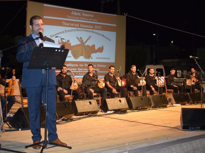 Η εκδήλωση ξεκίνησε με χαιρετισμό – καλωσόρισμα από τον κ. Λαγουβάρδο Νίκο, Πρόεδρο της Τοπικής Κοινότητας Βισταγής ενώ στη συνέχεια τη σκυτάλη πήρε ο κ. Γαλάτιος Μοσχονάς ο οποίος είχε, όπως χαρακτηριστικά είπε, διπλό ρόλο « Του οικοδεσπότη – ως Πρόεδρος του Δ.Σ. του Δήμου Αμαρίου και του φιλοξενούμενου - ως Πρόεδρος του Παγκρητίου Συλλόγου Καλλιτεχνών Κρητικής Μουσικής». Ο κ. Μοσχονάς στο σύντομο χαιρετισμό του αναφέρθηκε στις δράσεις και στους στόχους του Συλλόγου επισημαίνοντας: «Η μουσική και το τραγούδι υπήρχε ανέκαθεν σε κάθε έκφραση της ζωής των Κρητικών, στη χαρά μα και στη λύπη. Θρύλοι ζωντανοί, οι δάσκαλοί μας στη μουσική. Δεν μας δίδαξαν μόνο πως να παίζουμε και να τραγουδούμε. Μα κυρίως πως να φερόμαστε. Και αυτή είναι μια βαριά κληρονομιά, που εμείς τα μέλη του συλλόγου οφείλουμε να διατηρήσουμε, να εξελίξουμε, και να την προσαρμόσουμε στο σήμερα χωρίς να την αλλοιώσουμε. Βάζοντας και το δικό μας λιθαράκι λοιπόν, με εκλεκτούς μουσικούς, διοργανώνουμε μεγάλες συναυλίες σε όλη την Κρήτη, όπως αυτή που θα απολαύσετε απόψε για να διαδώσουμε το σύνθημα ότι η ‘’Μουσική Ενώνει’’, ο ‘’Πολιτισμός Ενώνει’’. Και ο τόπος αυτός, η Κρήτη μας, παραμένει ξεχωριστή στα βάθη της ιστορίας γιατί ο λαός της ήταν πάντοτε ενωμένος». Συνεχίζοντας, ευχαρίστησε τα Μέλη του Συλλόγου που τους τελευταίους μήνες, κόντρα στις επαγγελματικές και οικογενειακές τους υποχρεώσεις, δουλεύουν ασταμάτητα για το καλύτερο αποτέλεσμα. Κλείνοντας αφιέρωσε τη συναυλία στον Πρόεδρο του Συλλόγου Καλλιτεχνών Γιώργο Κατσαμά που πριν ένα χρόνο έφυγε πρόωρα από τη ζωή.