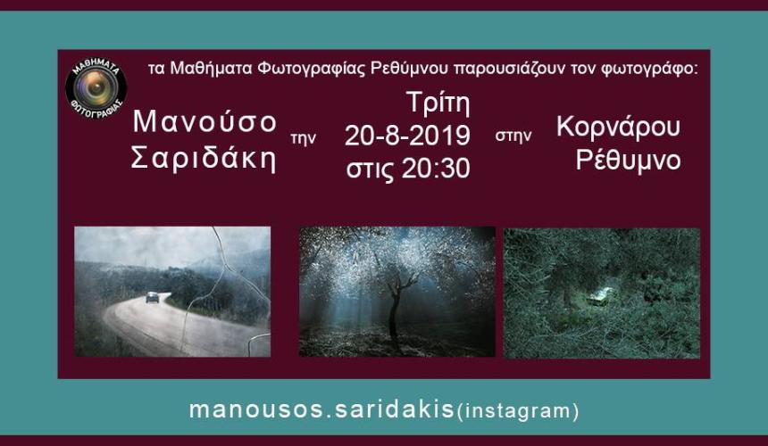 Ο Σαριδάκης είναι μαθητής των Μαθημάτων Φωτογραφίας Ρεθύμνου ο οποίος έχει φτάσει σε ένα υψηλό επίπεδο δημιουργίας φωτογραφικού υλικού, έτσι, είναι ο πρώτος μαθητής που παρουσιάζει την δουλειά του.