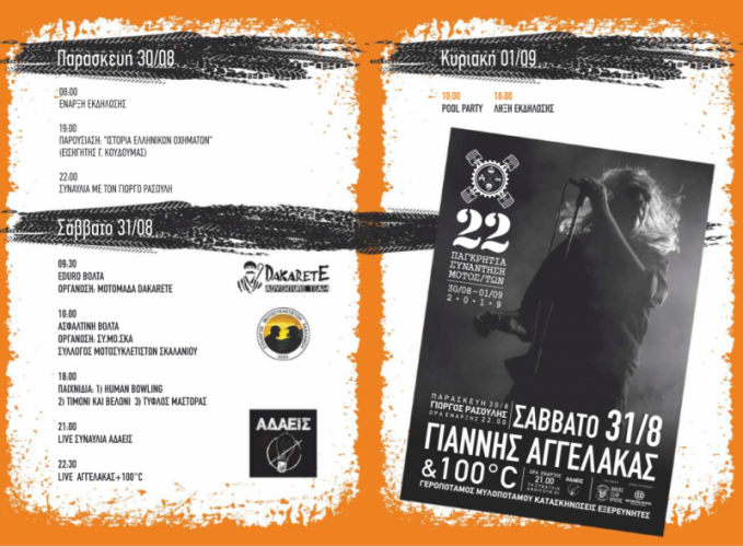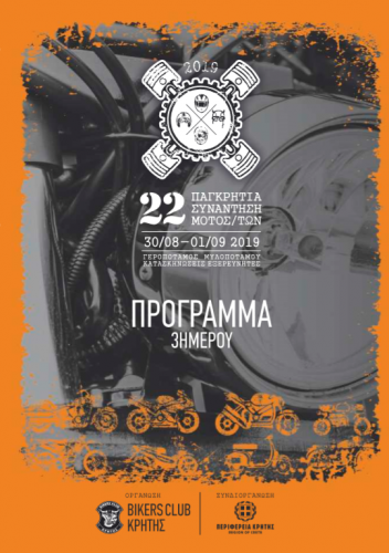 Πρώτη μέρα θα παρουσιαστεί ένα επιμορφωτικό σεμινάριο για την ιστορία των ελληνικών οχημάτων με εισηγητή το Γιώργο Κουδουμά και στη συνέχεια θα ακολουθήσει συναυλία με το Γιώργο Ρασούλη όπου θα μας ταξιδέψει σε παραδοσιακά και όχι μόνο μονοπάτια. Η δεύτερη μέρα θα ξεκινήσει με δύο βόλτες όπου θα ακολουθήσουν όσοι επιθυμούν κι έχουν τον κατάλληλο εξοπλισμό. Μία χωμάτινη όπου έχει διοργανώσει η μοτοομάδα adventure team DAKARETE και μία ασφάλτινη όπου την οργάνωση έχει αναλάβει ο σύλλογος Σκαλανίου ΣΥ.ΜΟ.ΣΚΑ. Ακολουθούν τα καθιερωμένα παιχνίδια όπου αναβάτες και όχι μόνο δοκιμάζουν τις δεξιότητές τους και συνεχίζει η ιστορία με την Ηρακλειώτικη μπάντα ΑΔΑΕΙΣ όπου μας παρουσιάζουν το νέο τους άλμπουμ.