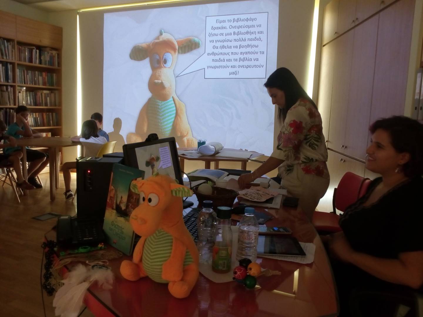 Εμψυχώτρια εργαστηρίου: Ελευθερία Καλούδη, εκπαιδευτικός, με το βιβλιοφάγο Δρακάκι της !