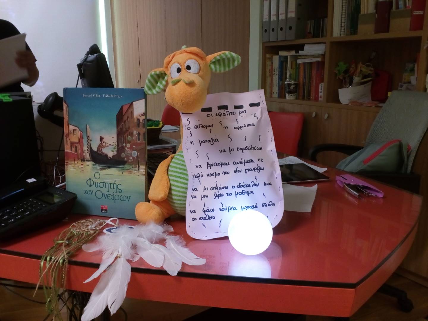 Η Ελευθερία Καλούδη και το βιβλιοφάγο δρακάκι της μας ευχαρίστησε όλους στη Βιβλιοθήκη για την φιλόξενη αγκαλιά που τους χαρίσαμε και μας ευχήθηκαν να μην μας εγκαταλείψουν ποτέ τα όνειρά μας. Παρόμοιες ήταν και οι δικές μας ευχές.