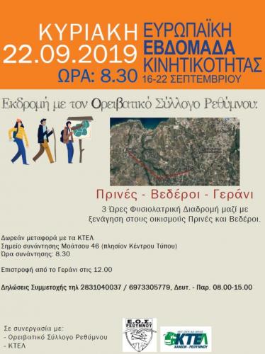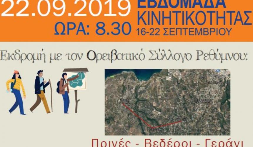 Την ερχόμενη Κυριακή 22 Σεπτεμβρίου 2019, ο Δήμος Ρεθύμνης σε συνεργασία με τον Ορειβατικό Σύλλογο Ρεθύμνου διοργανώνουν τη δράση «Περπάτημα στη φυσιολατρική διαδρομή Πρινές - Βεδέροι – Γεράνι», που εντάσσεται στο πλαίσιο των εκδηλώσεων για την Ευρωπαϊκή Εβδομαδα Κινητικότητας.
