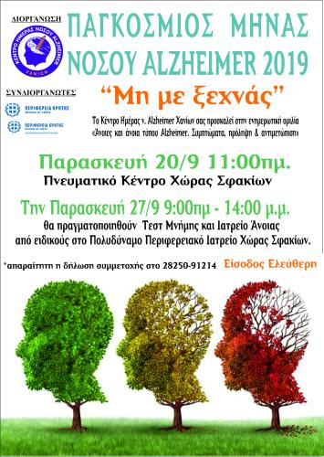 Με αφορμή τον Παγκόσμιο μήνα ν. Alzheimer το Κέντρο Ημέρας Νόσου Alzheimer Χανίων με συνδιοργανωτές την Περιφέρεια Κρήτης την Περιφερειακή Ενότητα Χανίων και σε συνεργασία με το Δήμο Σφακίων & το Δήμο Αποκορώνου διοργανώνουν δράσεις ενημέρωσης, πρόληψης και ευαισθητοποίησης για την Άνοια και την ν. Alzheimer.