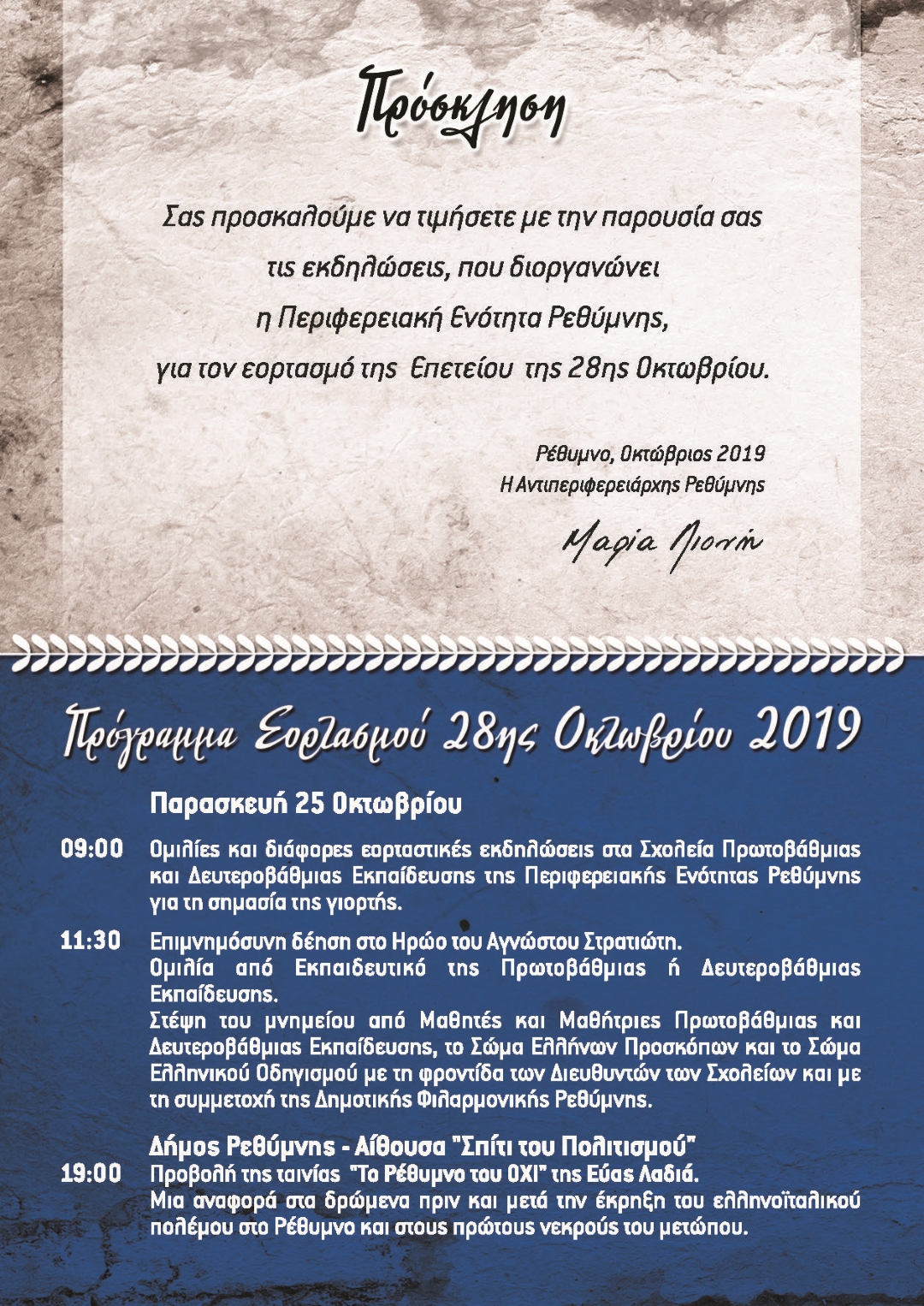 Ώρα 09:00 Ομιλίες και διάφορες εορταστικές εκδηλώσεις στα Σχολεία Πρωτοβάθμιας και Δευτεροβάθμιας Εκπαίδευσης της Περιφερειακής Ενότητας Ρεθύμνης για τη σημασία της γιορτής.